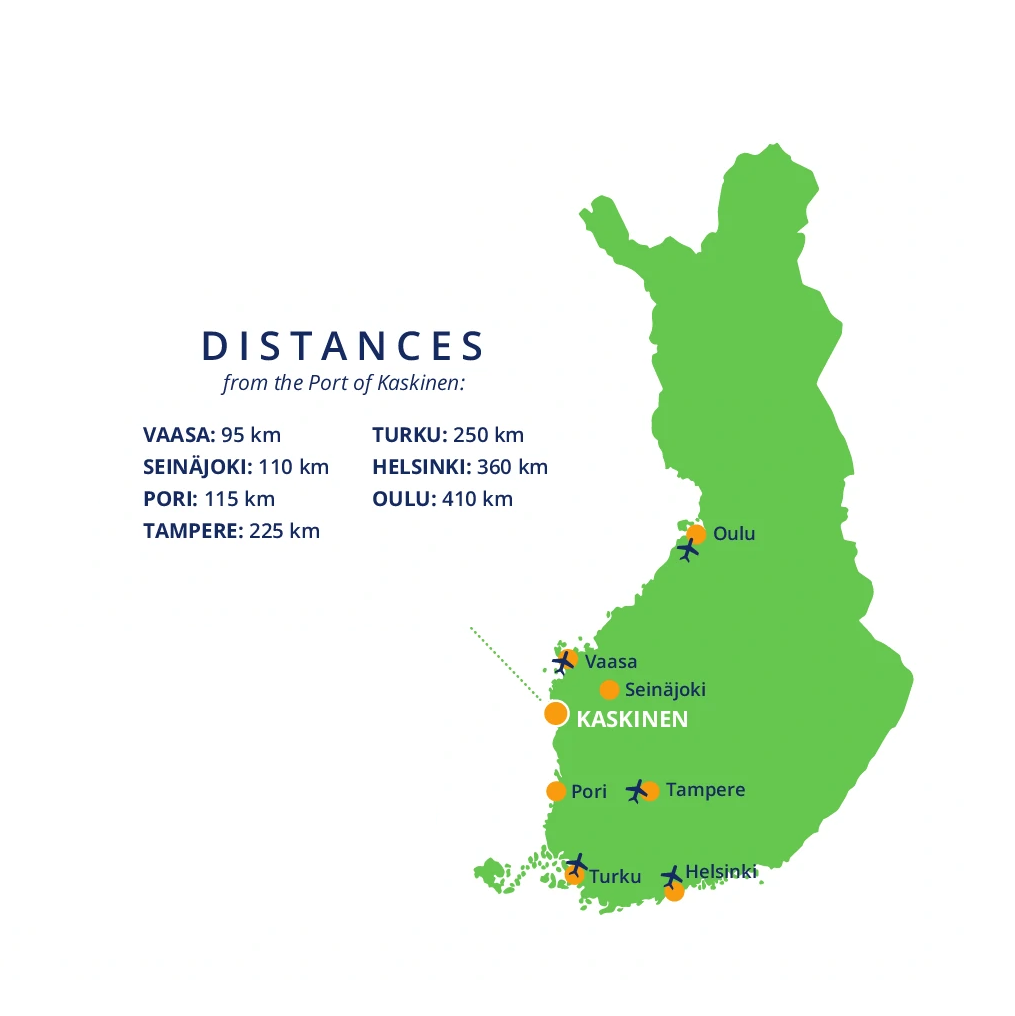 The Port of Kaskinen is located on the west coast of Finland, along the Gulf of Bothnia, approximately 100 kilometers north of Pori. The deep-water port provides a quick connection to the open sea and the Baltic Sea shipping lanes. Thanks to its sheltered location, assistance from icebreakers is rarely needed during the winter months.